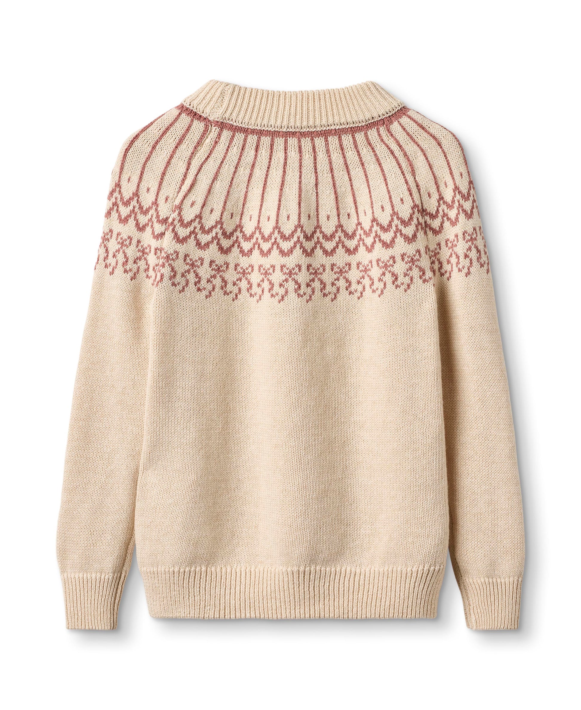 Knitted sweater in a soft quality with bows along the neck in a pink color. The sweater has raglan sleeves. The pullover has a loose fit making it comfortable to wear.